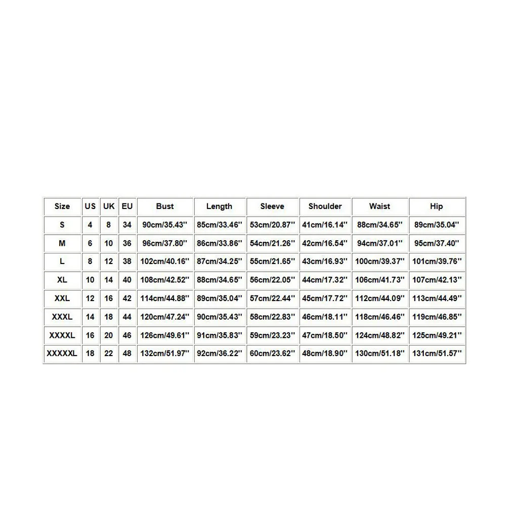 Size US UK EU Bust Length Sleeve Shoulder Waist Hip S 4 8 34 90cm/35.43” 85cm/33.46” 53cm/20.87” 41cm/16.14” 88cm/34.65” 89cm/35.04” M 6 10 36 96cm/37.80” 86cm/33.86” 54cm/21.26” 42cm/16.54” 94cm/37.01” 95cm/37.40” L 8 12 38 102cm/40.16” 87cm/34.25” 55cm/21.65” 43cm/16.93” 100cm/39.37” 101cm/39.76” XL 10 14 40 108cm/42.52” 88cm/34.65” 56cm/22.05” 44cm/17.32” 106cm/41.73” 107cm/42.13” XXL 12 16 42 114cm/44.88” 89cm/35.04” 57cm/22.44” 45cm/17.72” 112cm/44.09” 113cm/44.49” XXXL 14 18 44 120cm/47.24” 90cm/35.43” 58cm/22.83” 46cm/18.11” 118cm/46.46” 119cm/46.85” XXXXL 16 20 46 126cm/49.61” 91cm/35.83” 59cm/23.23” 47cm/18.50” 124cm/48.82” 125cm/49.21” XXXXXL 18 22 48 132cm/51.97” 92cm/36.22” 60cm/23.62” 48cm/18.90” 130cm/51.18” 131cm/51.57”