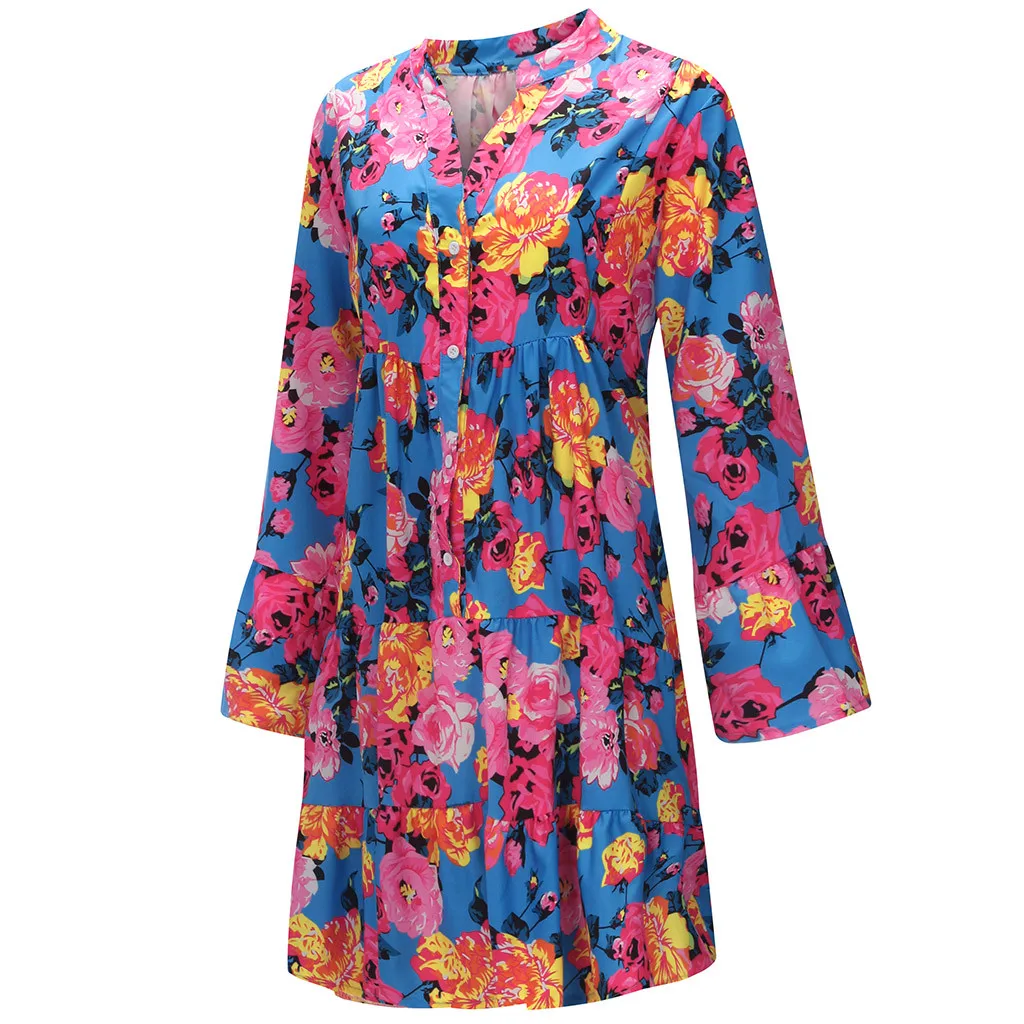 Summer Women Print Long Sleeve Shirt Dress Fashion Casual Loose Dress
